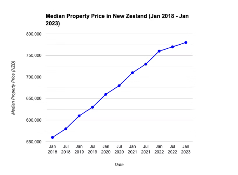The median property price in New Zealand rose from $560,000 in January 2018 to $780,000 by January 2023 (REINZ)